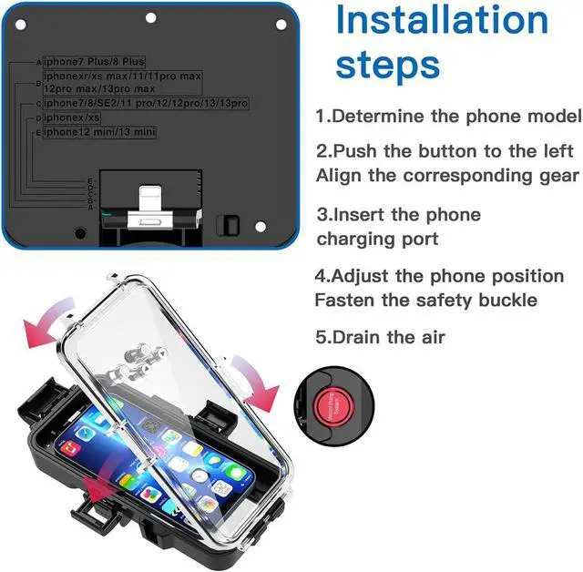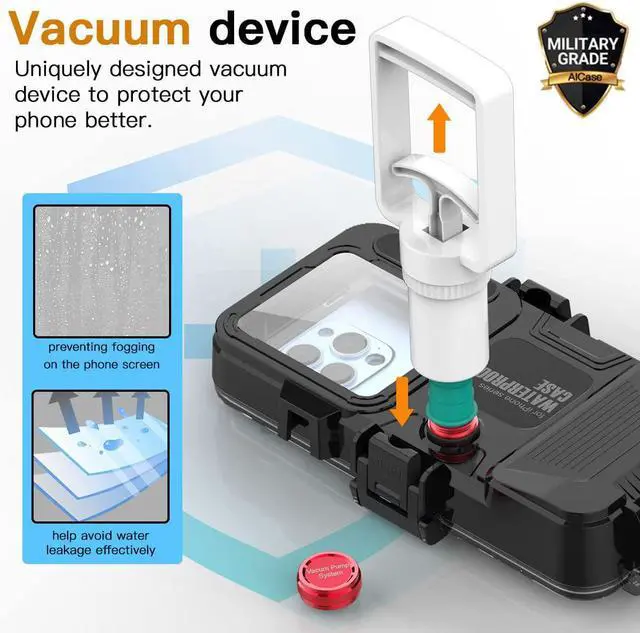 Uniquely Designed Vacuum Device --- Before using our products in the water,you need to use a vacuum pump to extract the air from the iPhone diving case.Which can better protect the phone from water leakage,also prevent fogging on the phone screen.This waterproof housing case with upgraded waterproof sealing ring and tight buckle that help avoid water leakage effectively.