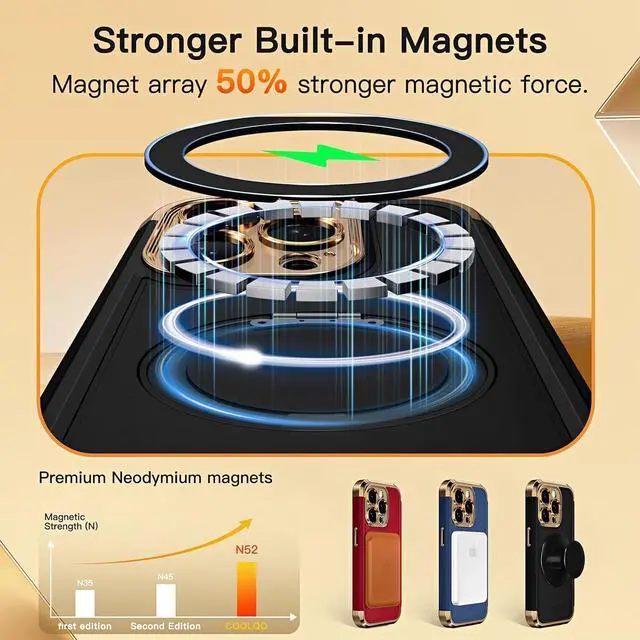 Besides the case with 3mm raised edges for the camera lips parts and 1.8 mm raised edges for the screen it can effectively prevent your phone from daily wear and tear drops and impacts. Super Magnetic Ring COOLQO for iPhone 14 Pro Max case fits to all MagSafe accessories made of N52 super-strong magnet array triple stronger magnetic strength than standard magnets provides a safe and efficient wireless charging experience. Much lower interference/loss to the charging of your phone. It can be attached securely to your car mount wallet battery pack car mount. You're free to enjoy fast charging at home in the office or on the go.