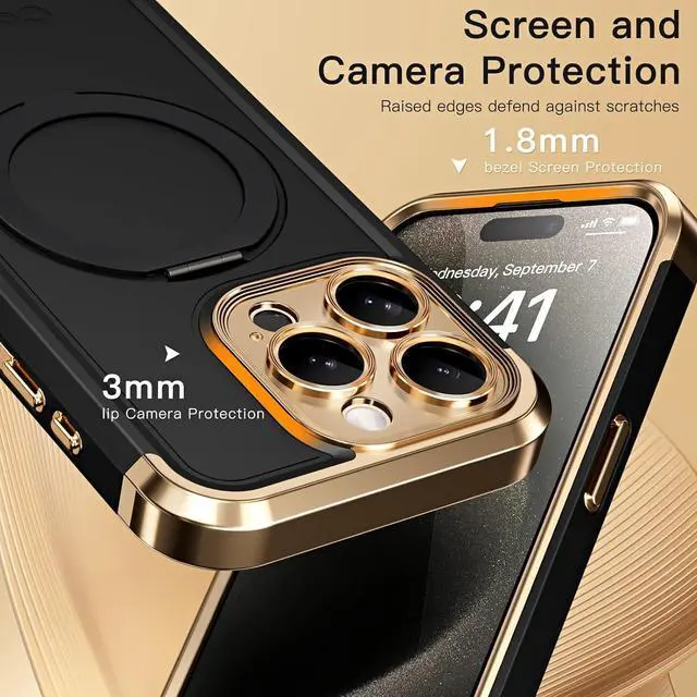 Give Life A Strong Pivot COOLQO case for iphone 14 Pro Max combined the strong magnetic technology with a rotatable foldable stand while no adding any bulk. The stand reinforced with Aerospace Aluminum Reinforcement and undergoes over 5000 open/close tests which can withstand up to 15kg of pulling force and not loosen or fall off during daily use. Props your phone up in a vertical or horizontal model (any angles) free your hands while watching or reading. Unique DesignThrough vacuum electroplating technology COOLQO have crafted a polished Noble Gold frame adds a gorgeous aesthetic to your iPhone.