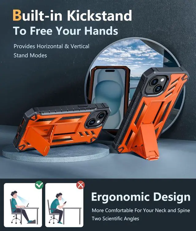 Kickstand: This iPhone 15 Phone Case with a stand works perfectly both in vertical and horizontal positions. Convenient for reading watching movies playing games browsing the web and face-to-face chatting with friends. Provides hands-free portrait and landscape viewing anglesBulit-in