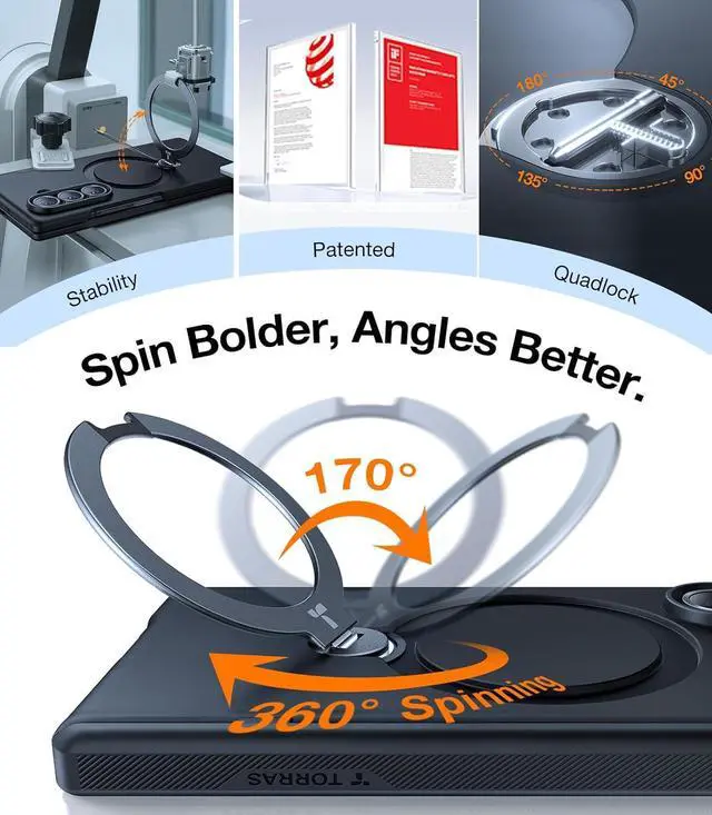 [Pioneering 360° Spin Stand] This case for Galaxy Z Fold 7 features a 360° rotating stand built into the backno extra gear needed. Whether you're watching video chatting or taking timer selfies just spin and set the perfect angle. The stand tilts up to 90° vertically acting like a mini tripod and stays sturdy at any position. From your desk to bedside table this Z Fold 7 case offers full-view flexibility. Tested through 30 000 rotations it's made to move smoothly and reliably. [Powerful Magnetic Snap Support] This case for Galaxy Z Fold 7 is compatible with MagSafe featuring a built-in 2nd-gen magnet ring with 40% stronger magnetic force and up to 18N holding power.
