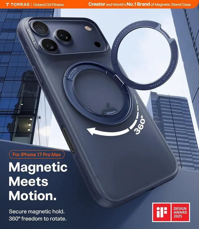 Confirm your model: Only for [iPhone 17 Pro Max]. Not for? iPhone 17 Pro/ 17. [The Original 360° Magnetic Stand Redefining Hands-Free Freedom] As the inventor of the 360° magnetic stand case TORRAS redefines versatility for iPhone 17 Pro Max. Stand vertical for FaceTime calls. Flip horizontal to capture group photos. Tilt 45° for hands-free cooking recipe scans. Each rotation delivers a satisfying Swiss-engineered click that signature sound of precision. Ostand O3 Fitness Series frees your hands to create share and live. [SnapLock Magnets Rock-Solid Lock Zero Worries] TORRAS exclusive Halbach Array locks the 17 Pro Max onto car mounts with a confident thunk. Engineered with N56SH neodymium it holds strong through off-road trails and city potholes zero wobble complete peace of mind. This is the magnetic case that finally delivers a perfect connection for Daily Magnetic Accessories so secure you'll forget it's even there. [4X Military-Grade Protection Lab-Tested for Stress-Free] Engineered for fearlessness the deep blue case for iPhone 17 Pro Max features TORRAS exclusive Triple-Runway Air Cushioning with visible 360° SHOCKMAT impact absorption tech. Precision-raised bezels ( 1.5 mm screen 2.5 mm camera) shield against concrete strikes and tumbles all lab-tested to withstand over 30 000 drops from every angle.