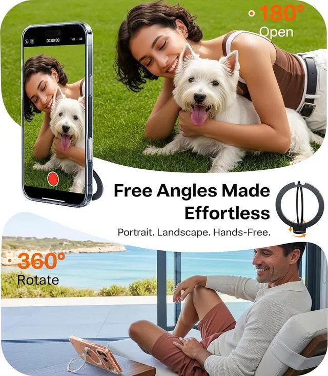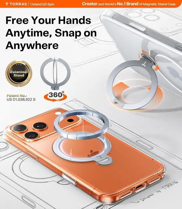[3-in-1 360° Spin Stand --- Work Play Create] Stand grip and wireless chargingall at once! The phone case for iPhone 17 Pro Max with stand(Patent no. US D1 038 922 S) provides a wider and more flexible adjustment angle reducing screen glare in landscape or setting it upright to act as a mini tripod with a unique 90° vertical position. Fit for iPhone 17 Pro Max case with stand the O-ring also functions as a secure grip giving you steady hands to prevent drops. When closed it lies flush for pocket-friendly carry and effortless wireless charging[18N Magnetic Lock --- Stronger Safer Connection] This case for i Phone 17 Pro Max with magnetic align perfectly with your phone for a seamless attach experience and safe wireless charging.