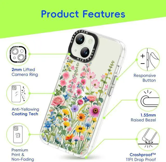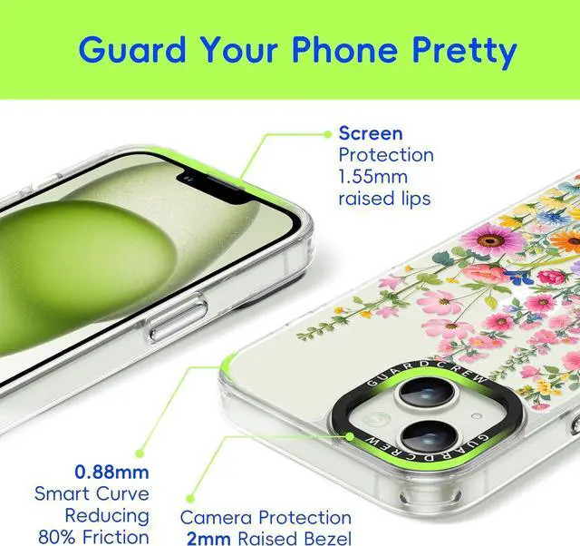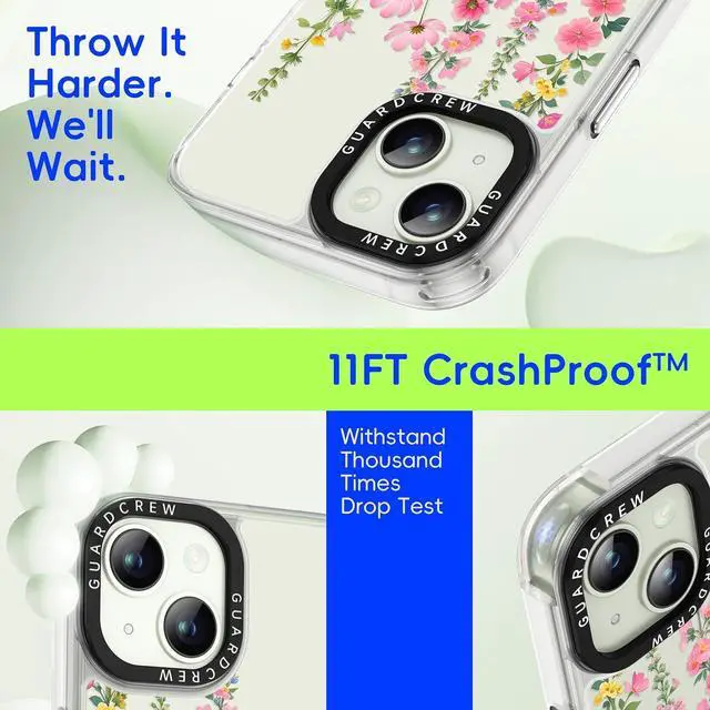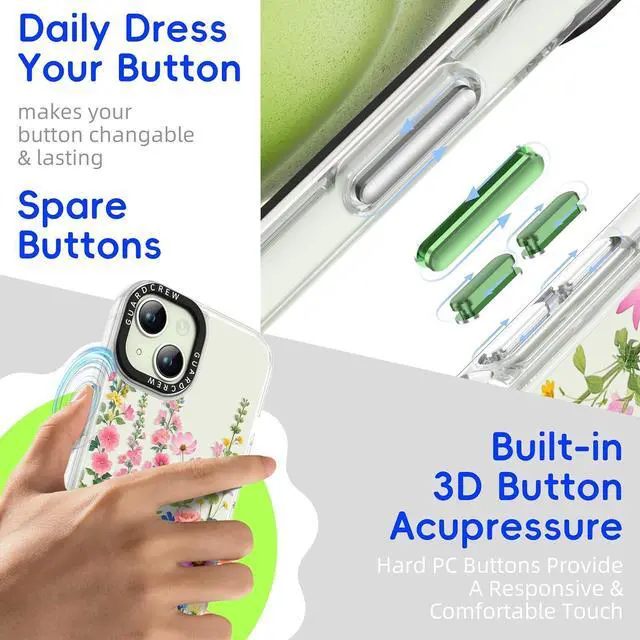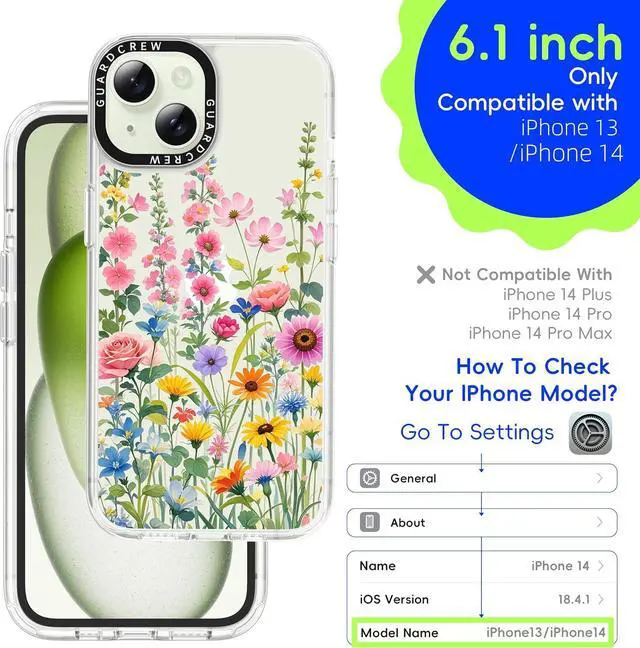 Exclusively designed for iPhone 13 ( 6.1 ) and iPhone 14 ( 6.1 ). Please double-check your phone model via Settings > General > About > Model Name to ensure compatibility before purchasing. [Crashproof Military-Grade Protective]Built with Crashproof tech reinforced corner airbags and Smart Curve edges to absorb up to 98% of impact. 1.552 mm raised bezels shield your screen and camera from scratches and drops. [3D Tactile Buttons with Spare Buttons] Unlike standard silicone cases the GuardCrew case features detachable hard 3D buttons for a more responsive and satisfying feel. Each case includes spare buttons in different colors letting you customize your case to match your style.