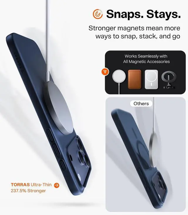 Ever Snap Hard Never Fall: No magnetic case compares to the Slim-Fit TORRAS! If youre looking for a slim magnetic case for iPhone 17 Pro this is your best choice. Equipped with 38 high-density N52 magnets it delivers a powerful 19N magnetic forceover twice as strong as standard cases. The embedded magnetic ring will never fall off or crack. Whether you're on a bumpy ride or making sharp turns this thin magnetic case keeps your phone securely in place. Compatible with