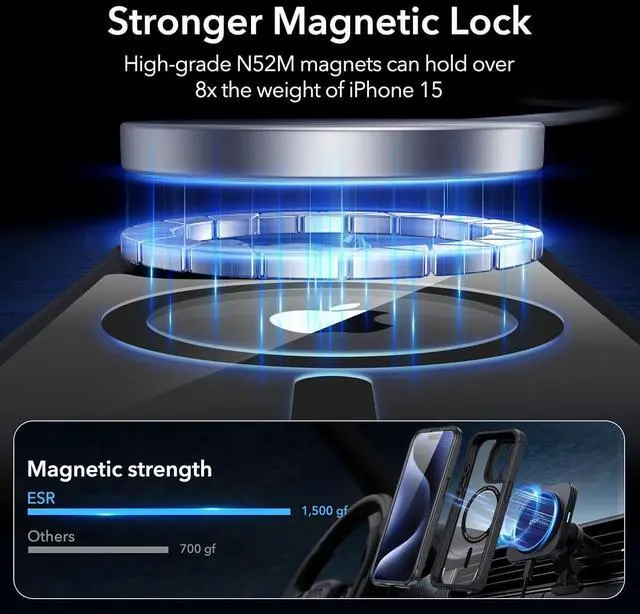 Magnetic Lock: powerful ring of magnets with 1 500 g of holding force enables faster easier place-and-go wireless charging and a secure lock on any MagSafe accessory360°