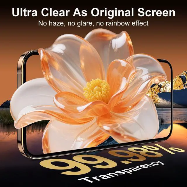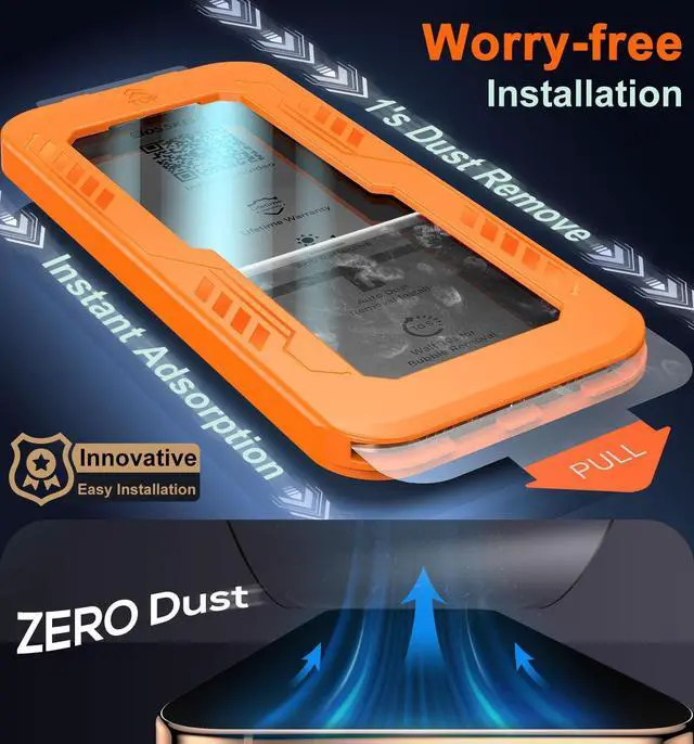 Compatible with most cases it blends invisibly for a built-in look while shielding every millimeter of your screen. Revolutionary Innovative Auto Installation The innovative auto-alignment frame + anti-dust adhesive technology ensures a bubble-free no holes zero-misalignment application in seconds. Just align press and pullno expertise needed! Includes a cleaning kit dust-removal stickers and a foolproof guide for stress-free setup. Ultra HD Clarity & Smoother Than Bare ScreenThis blue light glass anti fingerprint high transparency screen protector made with optical-grade and anti-blue light transparent glass and 4-layer nano-coating it preserves 99.99 % display clarity with zero color distortion and provide anti-blue light protection anti-glare anti reflective.