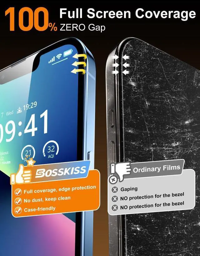 The X-Silk anti-fingerprint and oleophobic coating repel sweat/oil while the clear silky-smooth surface enhances touch sensitivity for gaming and typing. 24H Professional Customer SupportCustomer satisfaction is BOSSKISS service tenet! This package includes 2 iPhone 13 /iPhone 13 Pro/iPhone 14 screen protector a dust-free installation tool and a cleaning kit. If you have any questions during use please contact us. Rest assured we will provide you with a satisfactory solution