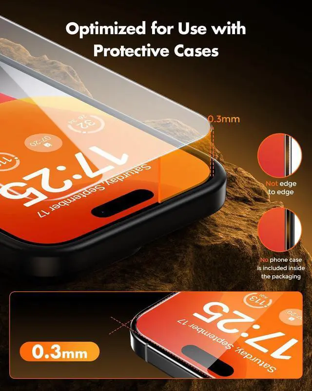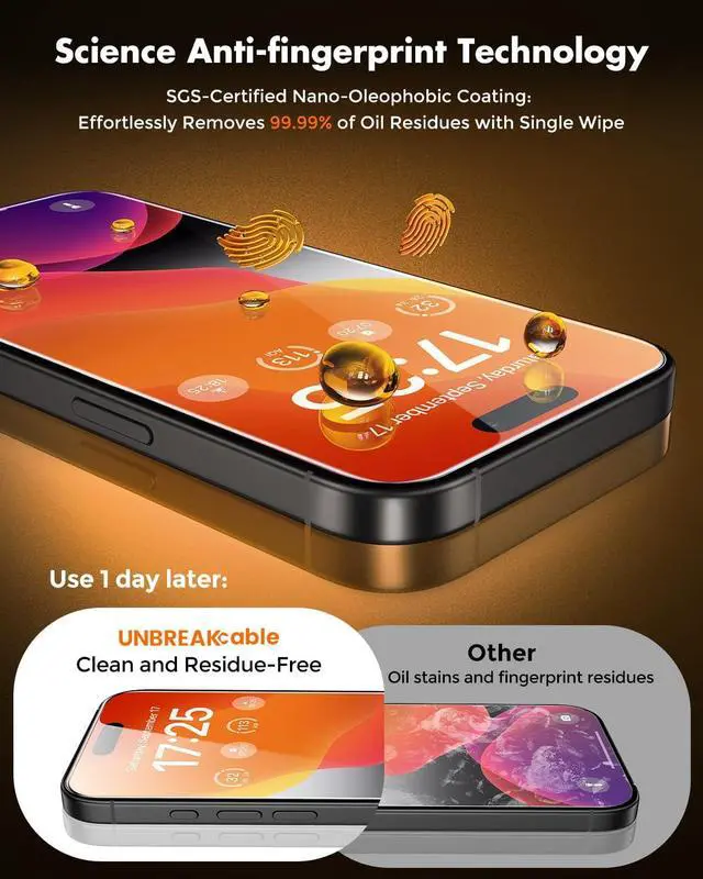 ?? Armor-grade 9H+ HardnessWhich makes this screen protector for iPhone 15 truly exceptional is that's made with aerospace-grade 9H+ high-hardness glass. Tempered at 400°C for 4 hours to achieve armor-grade protection: Shatter resistance Knife-proof scratch protection Built to last 7-8 times longer than ordinary glass. UNBREAKcable transforms your iPhone 15 with aerospace-grade defense forging an indestructible secondary shield that redefines screen resilience?? Newbie-FriendlyFeaturing an upgraded smart installation box dust-removal and bubble-removal tool. The exclusive positioning tool ensures millimeter precision without the need for repeated adjustments no more crooked installs. UNBREAKcable for iPhone 15 screen protector boasts a 98% installation success rate even for first-time users!?? Ultra HD Visual EnjoymentUNBREAKcable screen protector for iPhone 15 is crafted from premium high-aluminosilicate glass with over 99% light transmittance (30% higher than regular protectors). It significantly reduces light refraction for sharper screen edges and true-to-life color rendering in games and videos. Comfortable for long viewing offering a screen experience as clear as using a bare device?? Super Original Screen ExperienceUNBREAKcable for iPhone 15 screen protector is at just 0.25 mm thin it offers a silky-smooth touch and optimized Face ID compatibility that feels like the original screen: no lag no bulk no compromise. Smooth 2.5D rounded edges for a seamless feel. Upgraded with a plasma oleophobic nano-coating to repel fingerprints oils and sweat. Keeps your iPhone 15 screen crystal clear and easy to clean with just one wipe. Even after 72 hours of use fingerprint residue is reduced by 90%. Enjoy silky-smooth touch and say goodbye to greasy screens?? Uncompromising Quality Unwavering PromiseWith over 100 million units sold globally UNBREAKcable continues to set the benchmark for premium screen protection. Every purchase is backed by a?? 3-year extended warranty?? and?? 24/7 premium support?? for personalized one-on-one assistance whenever you need it