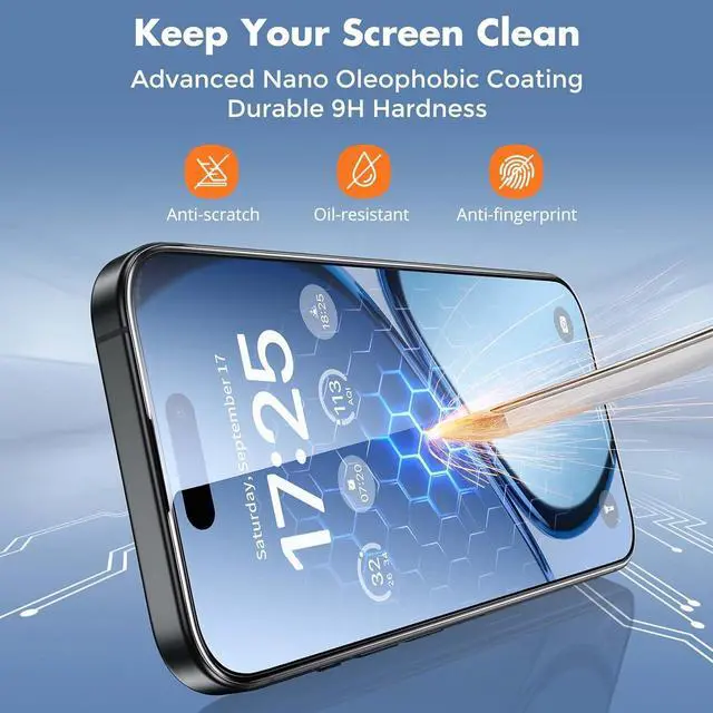 3D curved edge design: fully fits with iPhone 15 super-ceramic panel (curvature radius 4.5 mm) 99.9 % screen coverage (no white/black edges). Perfect compatibility with 95% of iPhone 15 cases on the market say goodbye to film case fight?????????????????????? -?????????????????????????????????????????? - This iPhone 15 screen protector uses nano-oleophobic coating (SGS certified) and the fingerprint residue is 92% less than that of others (after applying oil and wiping 3 times the others has 78% visible fingerprint area and ours only has 6%). After 5000 finger friction tests (MIT durability standard) the integrity of the oleophobic layer remains 98% (ordinary films is 60%-70%). Each film undergoes 20 quality inspections before leaving the factory and the uniformity of the oleophobic layer reaches 99.7 %. A special cleaning kit is included to increase the activation coating effect by 20%??.