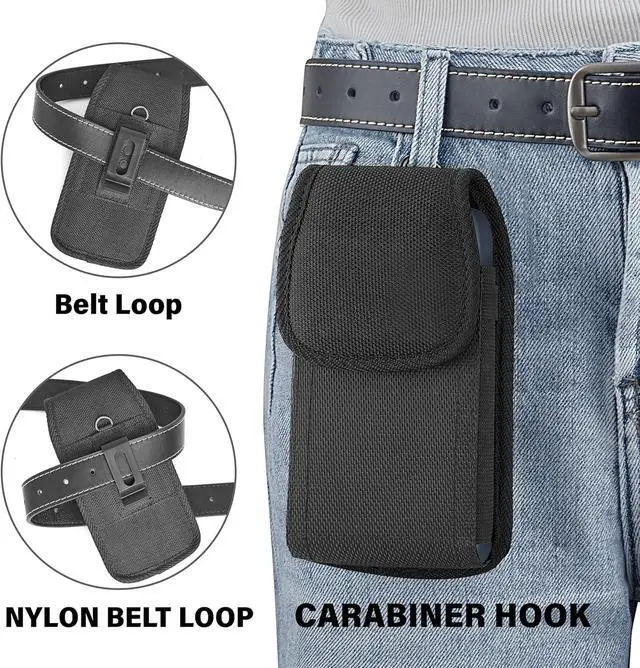 Heavy duty rugged black nylon cell phone holsters case with belt clip and belt loop for iPhone 16 iPhone 16 Pro iPhone 15 iPhone 15 Pro iPhone 14iPhone 14 Pro 13 Pro 12 Pro 11 Pro Xs Max and more (If you have different models check our other variations) This Phone belt holder can be securely attached to your belt with its durable belt clip or belt loop which is suitable for camping hiking outdoor living and trekking. Daily Protection & Easy Use- Velcro closure keeps your phone safe which prevents accidental opening and access to your phone easily and keeps it exactly where you need it (Large size pouch fits phone with case on) You have different ways of wearing a phone holster: Choose the belt loop option or clip it to your belt (Horizontal or Vertical position! ) waistband or inside your handbag's pocket. Never lose it again! Belt Phone Holder for men and women have Built-In Pen Holders one on each side of the pouch that can accommodate any standard-size pen.