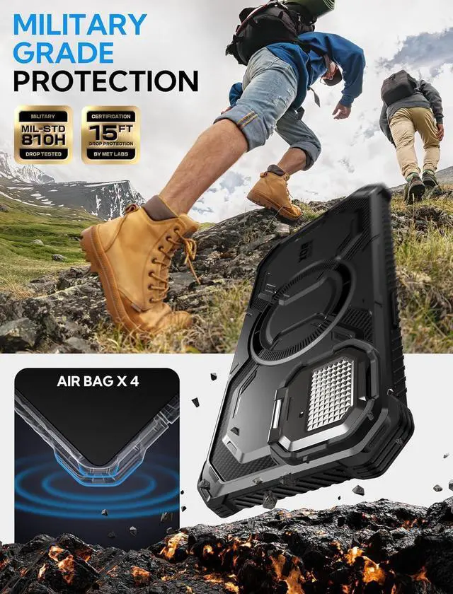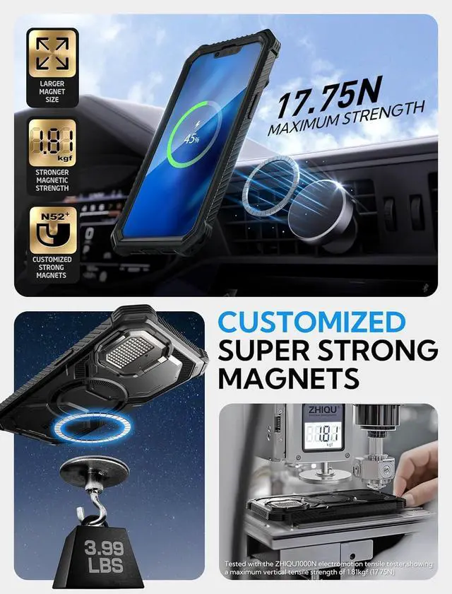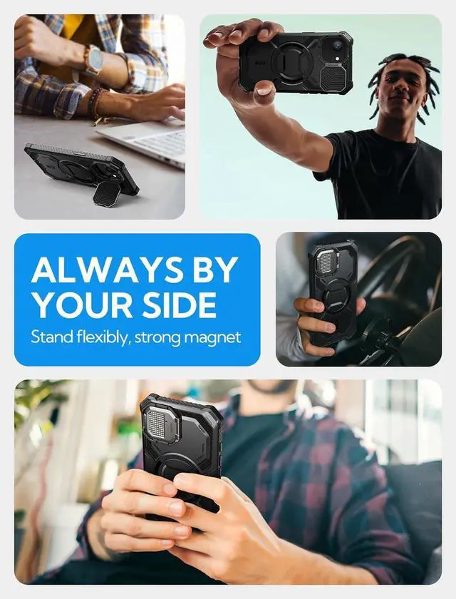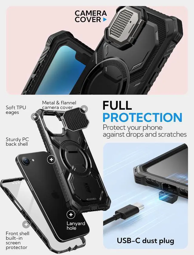Compatibility Compatible with iPhone 16e (2025 Release) & iPhone 17e (2026 Release) 6.1I nch. Built-in Screen Protector Built-in screen protector prevents scratches and cracks to screen without compromising touch sensitivity. Built-in Camera Cover doubles as KickstandZinc alloy anodized camera cover protect lenses while doubling as a kickstand to offer multiple viewing angles. Wireless Charging Compatible Built-in 12X Strong N52 magnets offer faster and more efficient wireless charging. It also works with magnetic car mounts. Military Protection Shock-absorbing TPU and raised bezels protect from bumps drops and scratches. (Certified MIL-STD 810G- 516.6 )