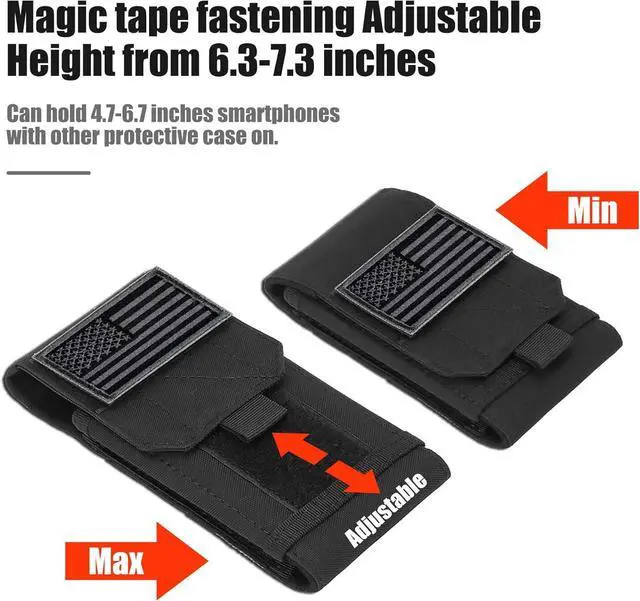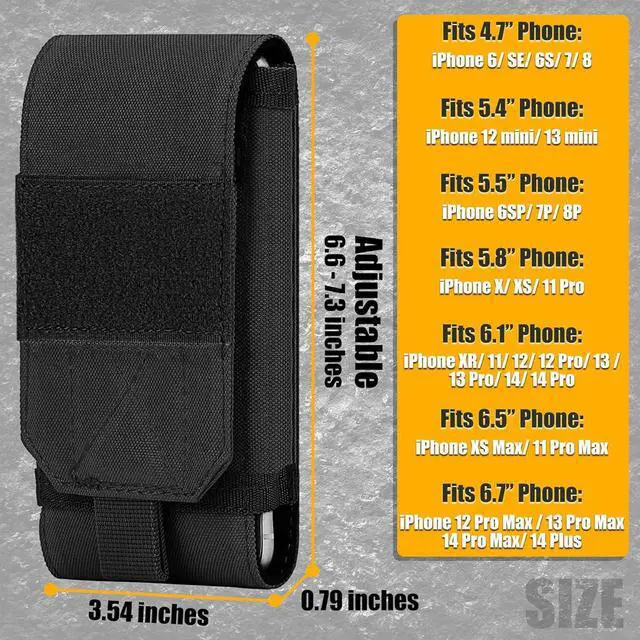 Adjustable height: up to 18.5 CM / 7.3. Can hold Galaxy Z Fold 2/Z Fold 3Can hold 4.7 - 6.9 smartphones with a slim case on like iPhone 17 Pro Max/17 Pro/17/Air/16 Pro Max/16 Plus/16 Pro/16/15 Pro Max/15 Pro/15 Plus/15/14 Plus/14 Pro Max/14 Pro/14/13 Pro Max/13 Pro/13/12 Pro Max/12 Pro/12/11 Pro Max/11 Pro/11/XS Max Galaxy S24 Ultra S24 Plus S24 S23 Ultra S23 Plus S23 S22 Ultra S22 Plus S22 S21 S20 S10Plus S10 S10E S9Plus S9 S8Plus S8 A3 A5 A7 J3 J5 J7 and etcStrong webbing belt loops on rear buckle deadly hard wearing & heavy duty. Allow for attachment of multiple Molle-compatible backpack pouch or vestChoose IronSeals choose a better lifestyle