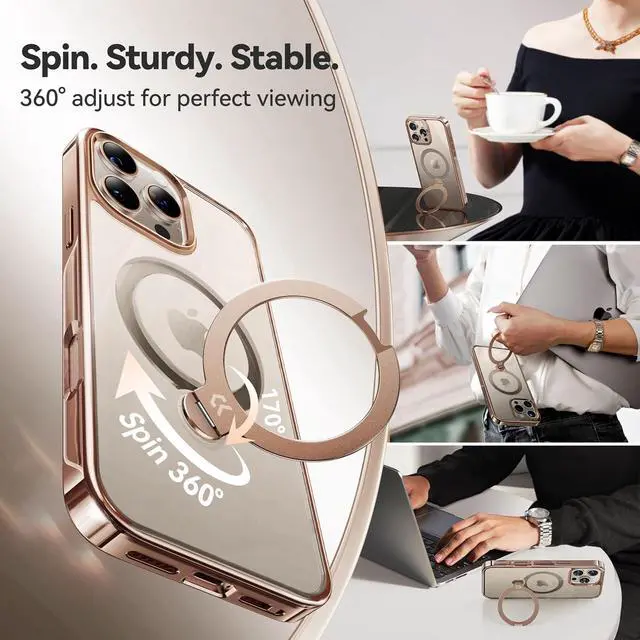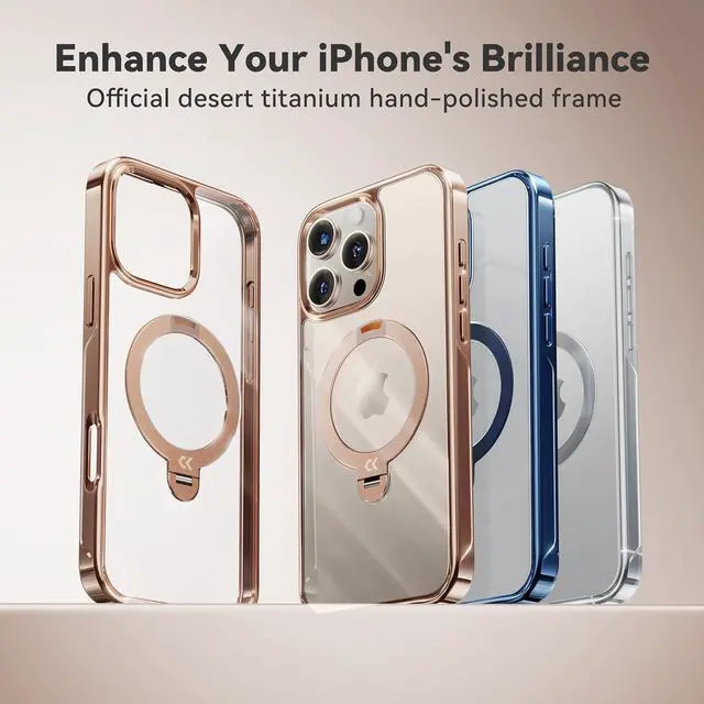 ? ONLY compatible with iPhone 16 Pro with a 6.3 -inch screen and 3 cameras. Not for the biggest iPhone. Please confirm your phone model before ordering360° Spin Stand-iF Design Award Winner Made from high-quality aerospace titanium material with high-temperature forging. The newly upgraded four-way locking titanium frame has increased the durability of the ring by 200%. Upgraded with horizontal adjustability based on vertical adjustment. Free your hands anytime anywhere making it perfect for hands-free video calls watching video or browsing content both horizontally and vertically. 180-Day WarrantyPremium Polished Rose Gold for iPhone 16 Pro Features a polished rose gold titanium frame and a transparent back made from imported TPE materials.
