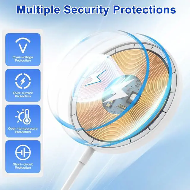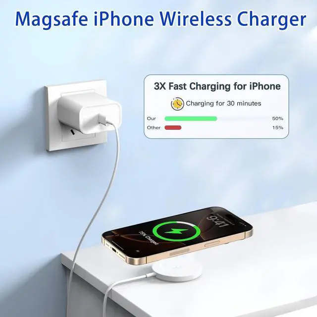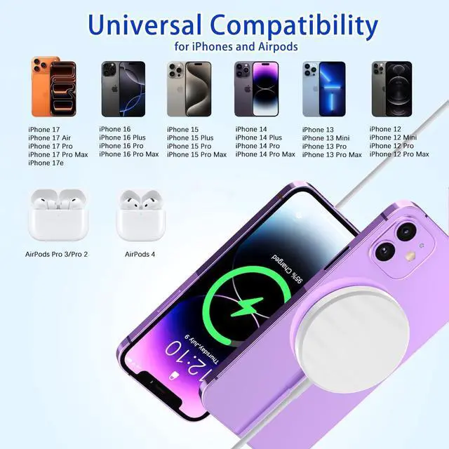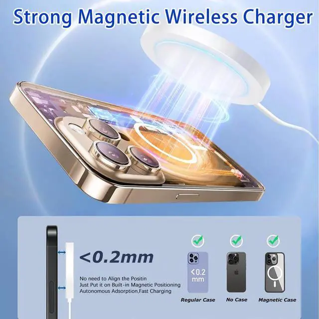 built-in N52 strong magnet array ensures perfect auto-alignment every time you place your phone down. providing a secure connection and maximizing charging efficiency for a hassle-free experience. [ Advanced Safety Protection Wireless Charger ]Your device's safety is our top priority. iPhone 17/16/15 faster wireless charger equipped with multiple built-in safety protection systems to prevent overheating overvoltage overcurrent short circuit etc. Comply with safety standards to ensure charging safety. [ Wide Compatibility for Devices ]Magnetic wireless charger is perfectly compatible with iPhone 17e/17 Pro Max/17 Pro/17 Air/17/iPhone 16 Pro Max/16 Pro/16 Plus/16/iPhone 15 Pro Max/15 Pro/15 Plus/15/14 Pro Max/14 Pro/14 Plus/14/13 Pro Max/13 Pro/13/13 Mini/12 Pro Max/12 Pro/12 Mini/12/ 3/Pro 2[ What You Get ]1Pack 3Feet iPhone magnetic wireless charger + 1Pack 20W PD fast USB C charger block.