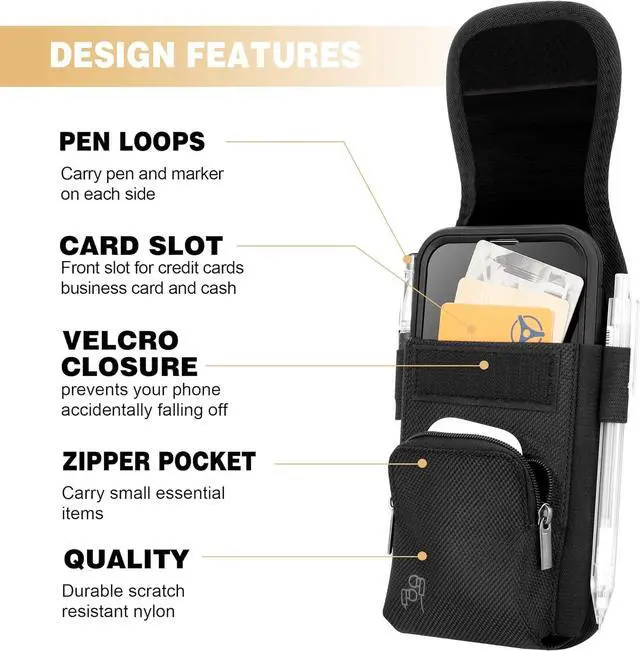 NEW FEATURES: Credit card pocket; double pen loops; dual directional zipper; belt clip stopper; thicker inner padding.