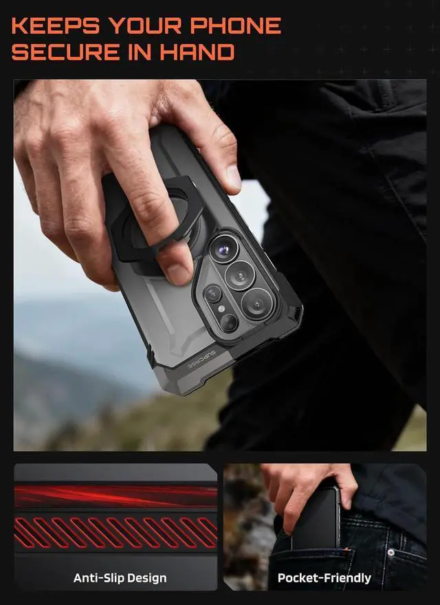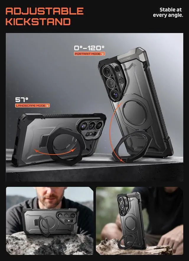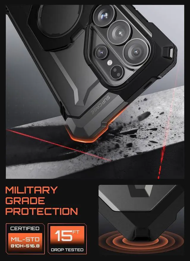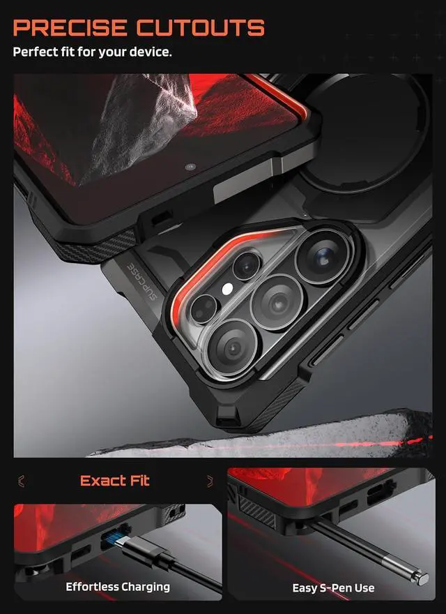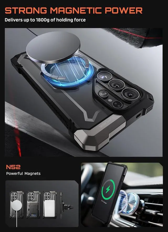 Compatible with Galaxy S26 Ultra 5G (2026 release) 6.9 inch only. The case is designed to match the original Galaxy S26 Ultra design with precisely aligned cutouts for easy access to the charging port and S Pen. Features precise magnetic alignment for stable wireless charging. Equipped with built-in N52-grade magnets delivering up to 1800 g of magnetic force. The backplate thickness is approximately 1.64 mm allowing compatibility with MagSafe accessories such as magnetic car mounts MagSafe wireless chargers magnetic card holders and desktop magnetic wireless charging stands. Aluminum alloy kickstand with a reinforced hinge.