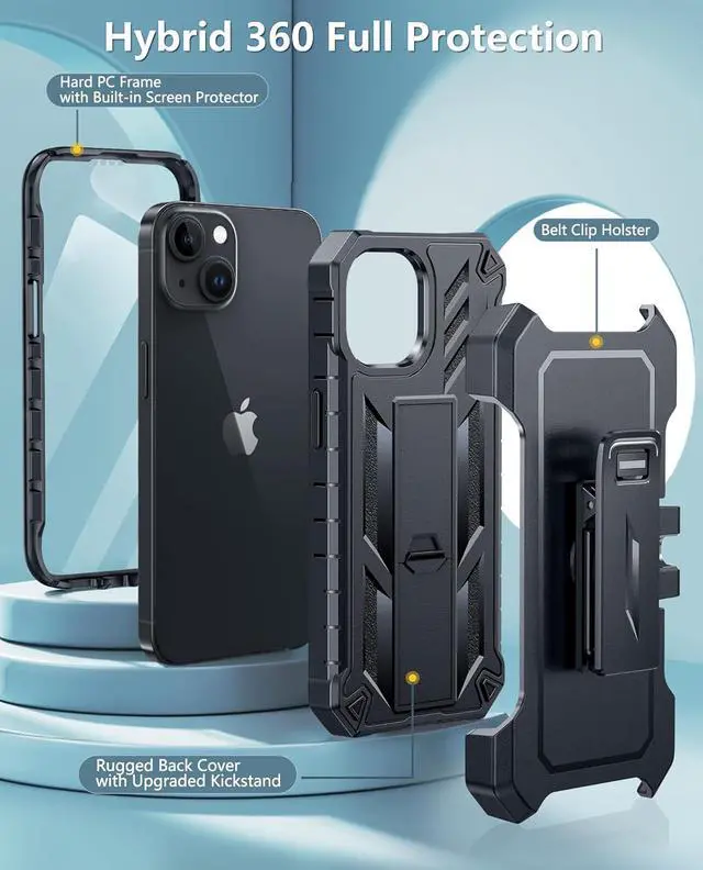 Rotatable Belt-Clip: The iPhone 15/14/13/16e phone case comes with a detachable swiveling belt clip holster which also can be as a stand offering hands-free pocket-free carrying. Provides full protection for your mobile phone case in all activities perfect for outdoor work camping hiking travel sports and moreScreen
