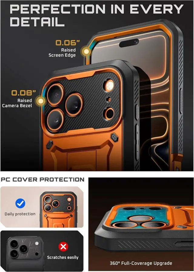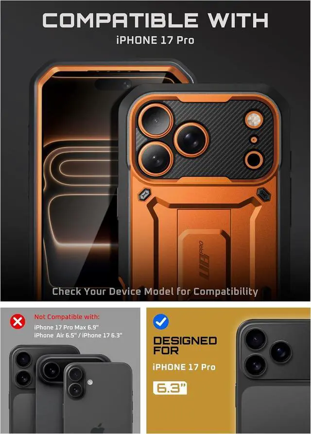 Ultimate Defense: Survives drops up to 20 ft (6 m) with military-grade impact resistance (MIL-STD-810H- 516.6 certified). Built with a hybrid TPU + PC frame reinforced corner airbags and a PET built-in screen protector. Precision-raised edges ( 1.5 mm camera lip 2 mm screen lip) and an ultra-slim ~ 3.94 mm back profile keep your device safe. Includes an additional TPU guard designed to protect the iPhone 17 Pro camera array. Experience the authentic iPhone 17 Pro camera control button. The built-in Camera Control Button is engineered with 19 pure copper conductors precisely matching the originals firm press and smooth swipe action. A detachable 360° belt clip is included. The fully rotating holster provides hands-free convenience while secure side clasps let you snap the case on and off effortlessly. Ready for work travel and outdoor adventures. Enjoy hands-free viewing in any orientation. The built-in kickstand provides stable multi-position supportprovide 50° for landscape or 60° for portrait. The easy-access design pops open instantly. Designed for comfort with a secure grip. Textured side edges improve control and reduce the risk of accidental drops. Compatible with iPhone 17 Pro 6.3 Inch (2025 Release) ONLY.