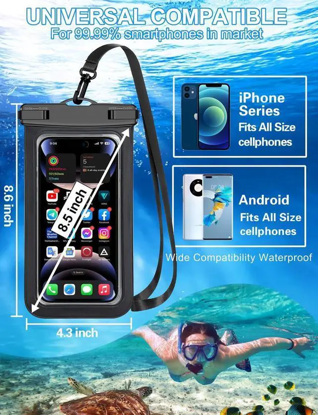 Length x Width: 8.6 x 4.3 Compatible for phone up to 8.3 inches; ideal phone water protector pouch for iPhone and up to 8.3; Sturdy lanyard on the top for easy carrying Free your hand and have fun!