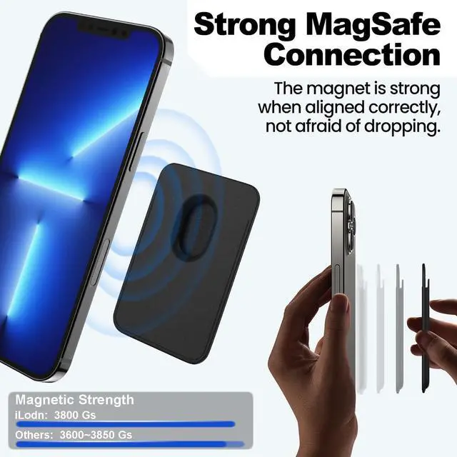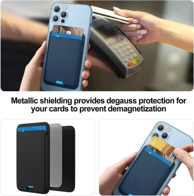 Quality and Design: Made with premium synthetic leather and exquisite craftsmanship. Holds up to 3 cards with a cut out on the bottom to push your cards up and out the wallet. The built-in card clip hold cards firmly in place even if its just one card. The leather wallet has a shield so it's safe for your credit cards. Say Goodbye with Your Bulky WalletSlim and Sleek Design Access Your Cards Easily: The design is very similar to the magsafe wallet but with a hole at the bottom that makes it easy to remove the cards when you need one ('s only has one hole in the back requiring you to take the wallet off to get cards out) and our magnetic wallet also holds stronger than walletStronger