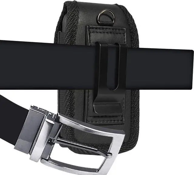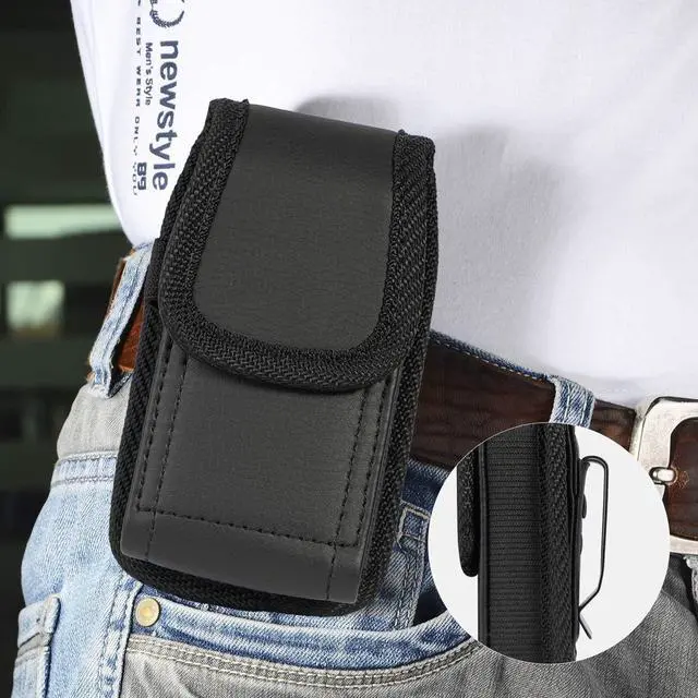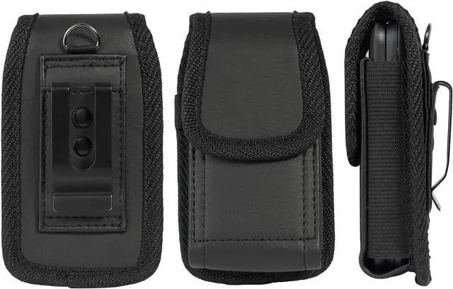 Premium Vegan Leather Pouch Case with Rugged Nylon Trim Keeps Phone Protected and ConcealedFree Your Pockets and Carry Your Phone in Comfort at Your Side with Quick AccessFixed Metal Clip with Low Profile Secures to Belt or WaistbandRear Sleeve/Loop to Thread Belt for Extra Stability Like a HarnessMagnetic Closure Keeps Case Closed Shut and Secure - Universal Design for Traditional Slim Flip Phones