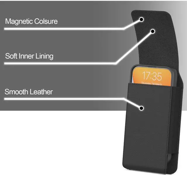 Pouch Dimensions: 6.9 x 3.25 x 0.8M agnetic Closure flop with soft inner lining and back with enhance heavy duty steel belt clip. Luxury smooth and soft touch leather. Pouch will Fit these