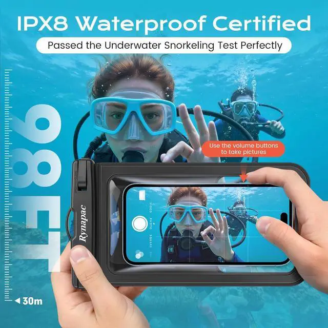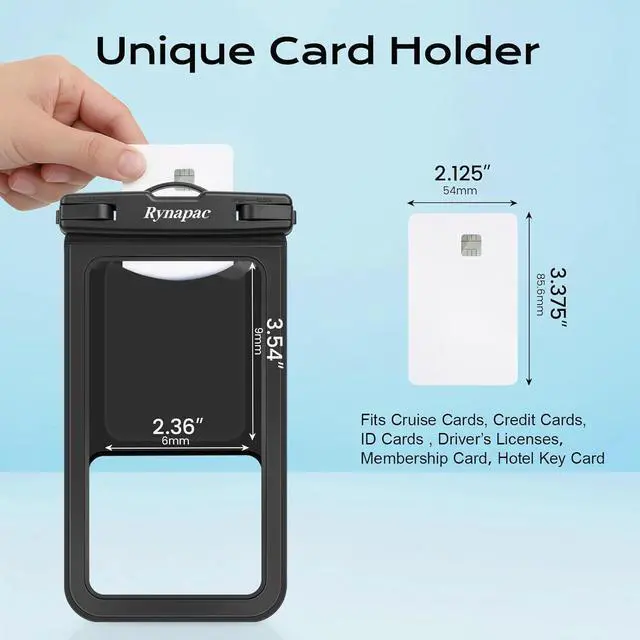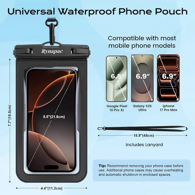 IPX8 Waterproof Certified Protection- IPX8 waterproof certified phone pouch features a secure triple-seal design combined with a reinforced snap-lock closure providing reliable protection against water splashes sand and snow. Safely submersible up to 30 meters keeping your phone dry during swimming snorkeling boating kayaking and beach or cruise vacationsBuilt-in Card Slot for Essentials- Designed with an independent inner card slot to securely hold your ID credit cards cruise card room key keeping your essentials organized and separated from your phone. No need to carry a card holder while swimming cruising or enjoying beach vacationsUniversal Compatibility- This waterproof phone case with lanyard easily accommodates for iPhone 17 16 15 14 Pro Max Galaxy S26 S25 S24 S23 Ultra It comes with a lanyard for convenient hands-free carrying while swimming boating cruising and enjoying beach activities (Note: if your phone's case is too big please remove the case before putting it in)Responsive Screen Touch- Even when fully sealed the waterproof phone pouch maintains high touchscreen sensitivity allowing you to text browse and take photos with ease. Face ID compatibility enables quick verification without removing your phoneUltra Clear Photography- The waterproof phone pouch features a highly transparent window this waterproof phone pouch supports sharp photos and videos during snorkeling swimming and beach activities. Capture underwater moments with confidence while keeping your phone protected. (At certain water depths water pressure may affect touchscreen responsivenessusing the volume buttons for photos is recommended. For best performance limit underwater use to no more than 1 hour)Warm Reminder- Read the precautions carefully before using the waterproof pouch. Test the waterproof function with a paper towel before each use squeeze air before sealing and submerge in water for about 10 minutes. Do not store sharp objects with this beach accessory for vacation avoid exposure to the sun to prevent the phone from overheating and shutting down automatically