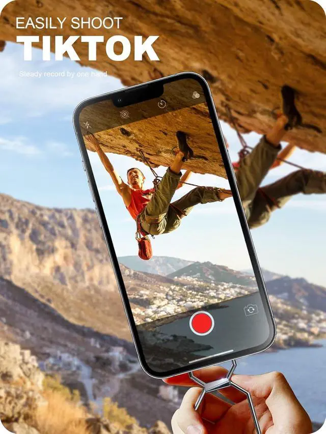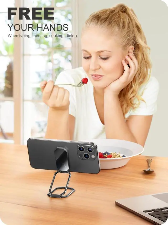 This cellphone ring holder can prevent your phone slipping from your hands when your hands are full in crowd. This phone finger holder is still brand new after 10000 times professional weight and swing tests. Hold Your Phone Stably in Various Angle by 2 Rotational Arms & Base This phone gripper adopts 2-jointed 180°adjustable arms and base offer you 360°rotation. You can hold your phone at any angle and height as you like. This phone stand can help you to shoot the Vlog or TikTok by holding it horizontally or vertically with one hand. Working as fodable phone grip or handy collapsible finger holder if you'd like to set it on a desk to meet cook read chat dinner exercise and watch a video.