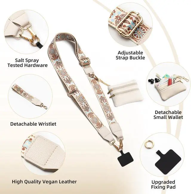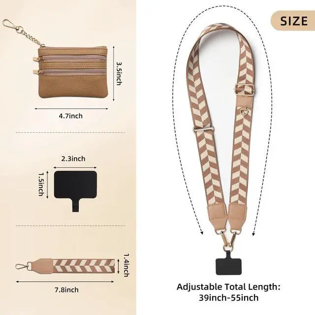 Wallet: This ultra-versatile crossbody phone strap with wallet features a detachable wristlet and removable small pouch. With a fully adjustable length it effortlessly switches between comfortable neck wear and hands-free crossbody styling fitting different body types and usage scenarios. Beyond phone carrying it serves as a practical ID lanyard for work/events a convenient keychain to organize keys or a stylish replacement strap for your favorite bag.