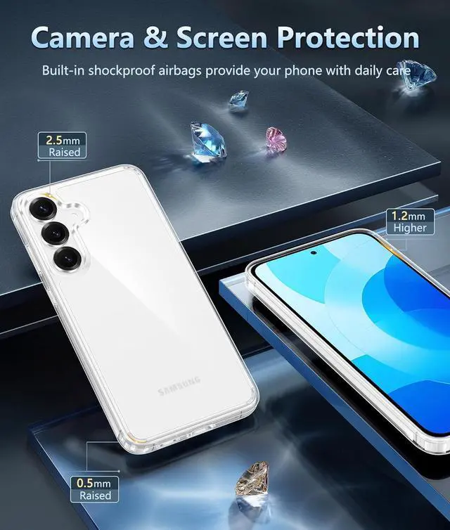 Grade Protection: Passed Military Drop Tested up to 10 FT. This Galaxy S25 FE clear case features a tempered glass screen a rigid polycarbonate backplane and flexible shockproof TPU bumpers around the edge plus 4 built-in corner Airbags to absorb impactScreen &