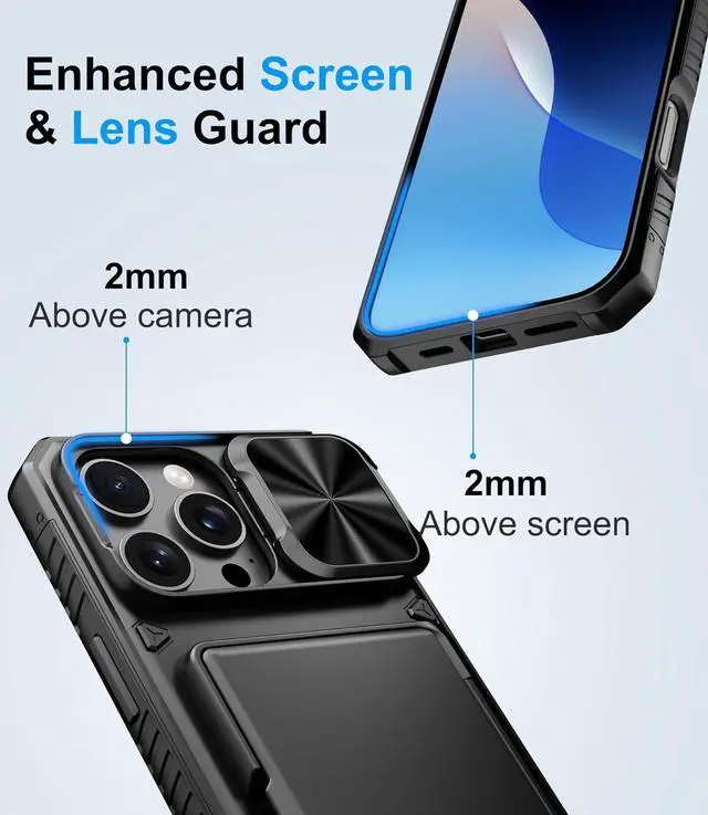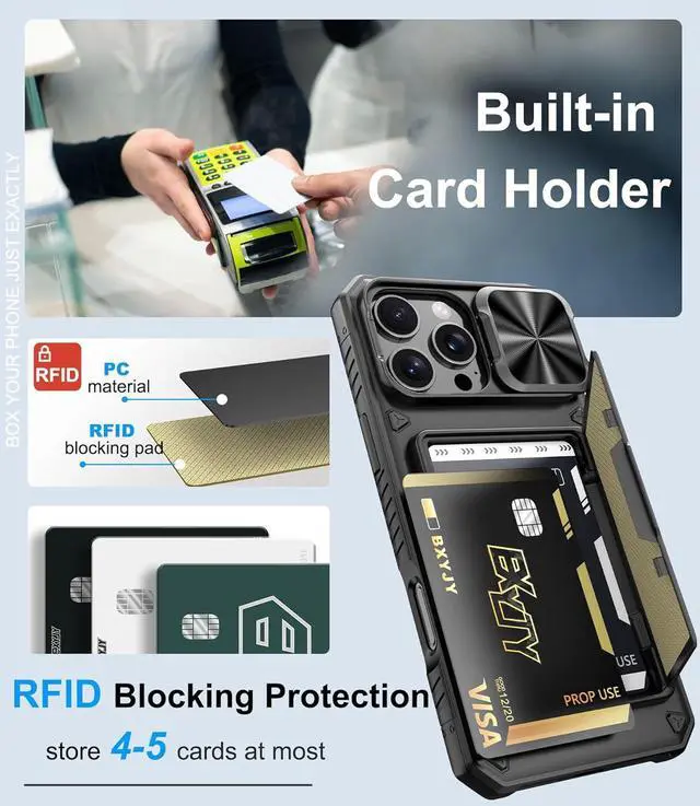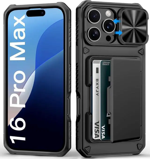 Notice: Not Compatible with Wireless Charging? Keep Your Cards Handy in Safe RFID Protection. Slim Down Your Pocket! Our iPhone 16 Pro Max wallet case is built in a card holder that can securely store about 4-5 cards according to the thickness (ID/credit cards/etc. ) or a few sheets of cash to replace your bulky wallets for convenience when going out in daily life. Moreover we have embedded the RFID blocking protection in the card holder to protect against data theft by RFID s. Extraordinarily convenient and secure for your travel? Slide it! Protect What's Important! Slide Camera CoverInnovative design with sliding camera protector and 2mm raised lips around the camera the BXYJY iphone 16 pro max case with card holder provides full protection for the back lens to avoid scratches and drops. No more worries about damaging the camera lens and protect your privacy? No Fear of Drops! Upgrade Rugged Military Grade Drop ProtectionMade of a matte PC hard back and soft TPU bumper This BXYJY iphone 16 pro max case with camera cover is also equipped with an upgraded shock-absorbing airbag on every corner 2mm raised edged protection for screen and camera and inside microfiber lining to withstand shock and drop inside whose total structure highlights the best shock solution of the case to prevent the unexpected drops scratches and impact? Precise Cutout Floating Button and Eyelet for StrapThis BXYJY premium phone case for iphone 16 pro max is cut out precisely for easy access to all the functions of your phone and fits snugly to protect the exterior parts.