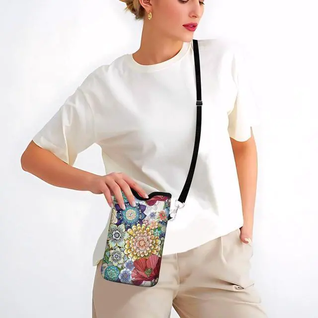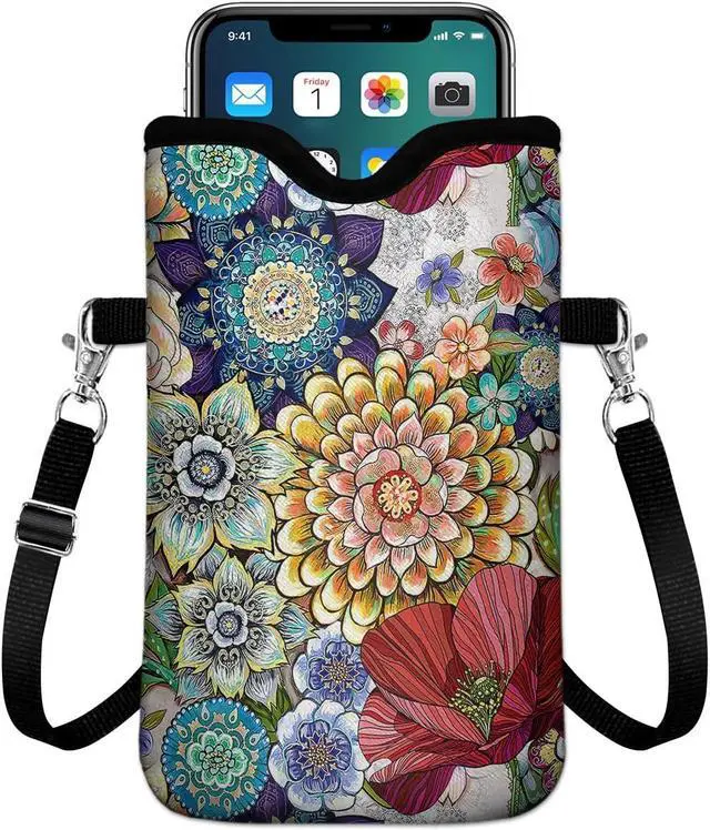 Neoprene cell phone sleeve pouch with Shockproof and Water-Resistant material to protect your phone well from crack falls and drops. ODORLESS material cell phone sleeves have 2 POCKETS inner to store more small daily things not only carry the phone-Easy to carry out. Phone bags with crossbody strap is adjustable allowing you to wear it in multiple ways carry the bag as a cross body cell phone purse sling shoulder bag or neck pouch. Phone bag with smooth Velcro Tape closure can security hold your Phone ID cards keys money headphones tickets wipes. Phone bag purse size is 7.6 x 4.3 inches phone bag compatible for ALL phones under 7.3 inches.