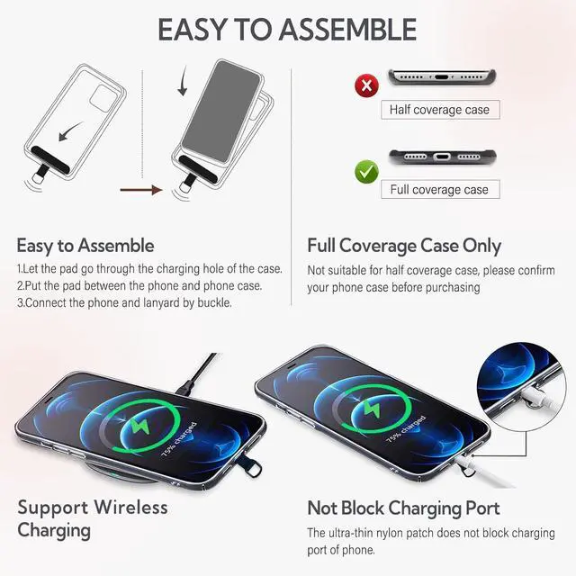 Charging Port: Universal cell phone chain Made of sturdy fabric and metal D-buckle. It has been tested many times and won't break even if you tear it hard. Therefore you don't have to worry about your phone falling off suddenly. The ultra-thin tear-resistant pad supports both wired and wireless charging without removing it. Cell phone strap suitable for all smartphones with a full-coverage case. Please note that it does not support half-coverage phone casesPackage and warranty: The package includes 2× Pads 1× Adjustable Leather Phone Straps 1× Phone Wrist Strap 1× Finger Strap. BFSD-DM offers a 30-day warranty on all of our products and if you encounter any problems during use we are ready to provide you with friendly and convenient support services