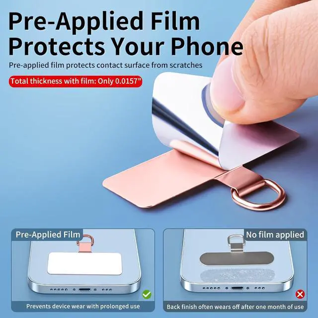 Unbeatable 44lbs Heavy-Duty Phone Lanyard Tab Engineered to hold an incredible 44lbs (20kg) our metal phone tether tab offers unparalleled security. This heavy-duty lanyard attachment far exceeds the strength of flimsy alternatives making it the ultimate phone tether tab for iPhone & Android during running hiking travel or work. Never worry about your phone dropping again. Premium Steel Construction & Anti-Scratch Phone Case Insert Crafted from high-strength steel this is more than an ordinary patch; it's a robust phone lanyard anchor. A protective film ensures it acts as a safe phone case insert for strap safeguarding your device from scratches while providing a reliable lanyard connector for phone.