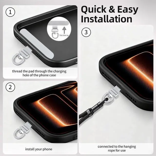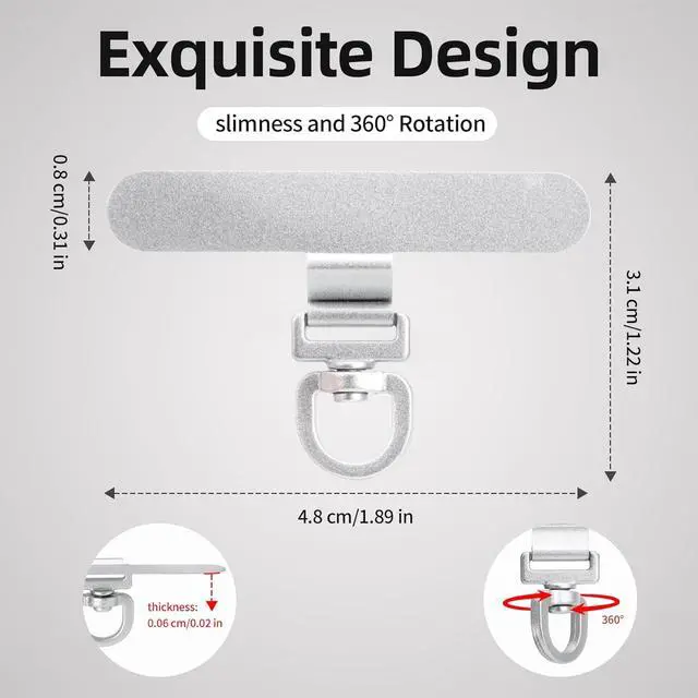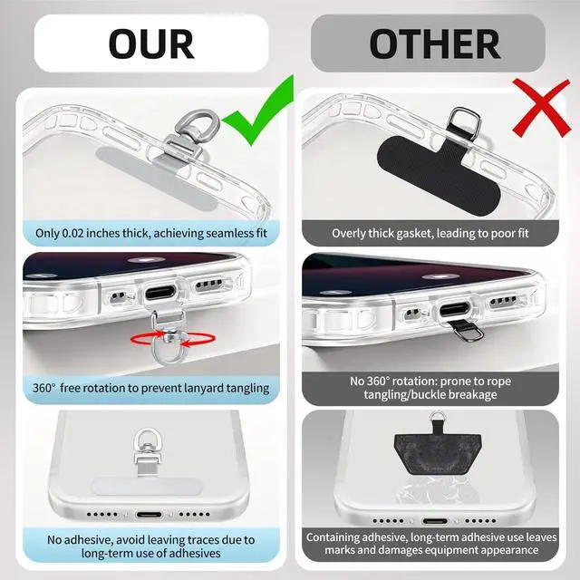 [360 ° Flexible Rotation Design] Comes with a rotatable lanyard ring that supports 360 ° free rotation effectively solving the problem of twisted and tangled lanyards[Wide compatibility] The ultra-thin 0.02 -inch design does not block the charging port at all and both wired and wireless charging can be used directly without removing the pad. Compatible with most smartphones such as iPhone compatible with various wristbands lanyards crossbody straps and keychains[Durable and Portable Material] Premium rust-resistant stainless steel material with good flexibility which not only avoids scratching the phone case but also has excellent anti rust and anti fading performance[Multi scenario Practical] Paired with a lanyard or wristband hands-free use can be achieved.