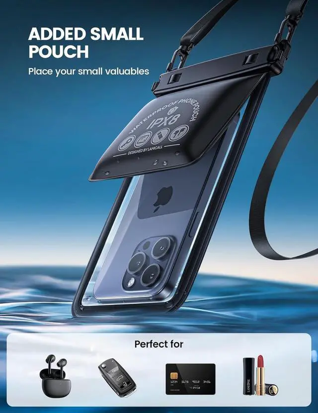 Double pocket design: Lamicall waterproof phone pouch has 8.3 bag with extra small bag( 3.9 x 4.17 ) that can store extra thing. Double Bag for cash keys bank cards lipstick and other valuables. The separate pocket design does not block the lens of the mobile phone and can be adjusted to fit more phones. Even if you are underwater you can also capture beautiful moments at any time.
