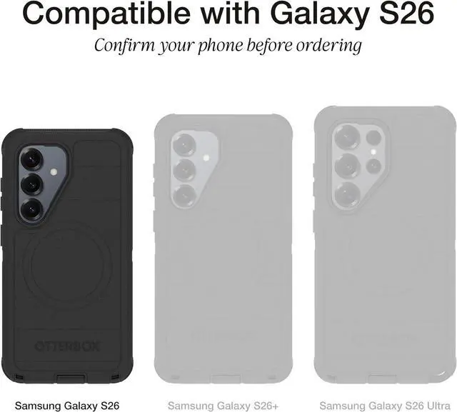 PRECISION FIT - for Galaxy S26 and engineered for a snug form? fitting profile. RUGGED MULTI? LAYER IMPACT SHIELD - Dual? layer protection combines a rigid shell with a rubber interior for 3X military? standard durability for Galaxy. SECURE GRIP PROTECTION The trusted Commuter Series for Galaxy features rubber? grip edges that provide a confident hold while the slim design delivers trusted OtterBox durability and protection for Galaxy. MAGNETIC FAST CHARGE Built? in magnets align perfectly for reliable Fast Charge performance keeping your Galaxy powered at all times with ease.