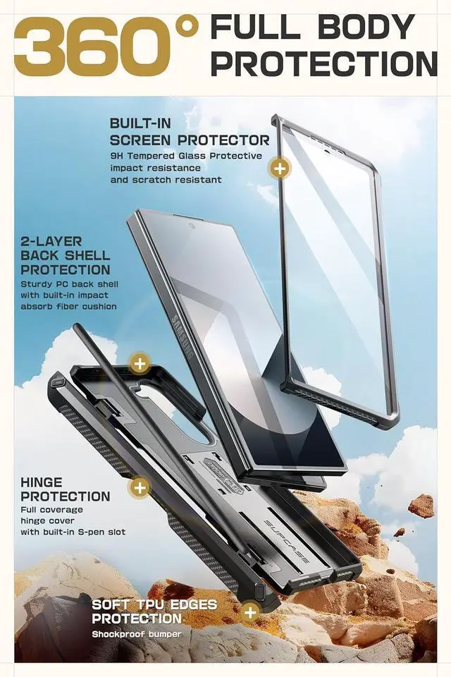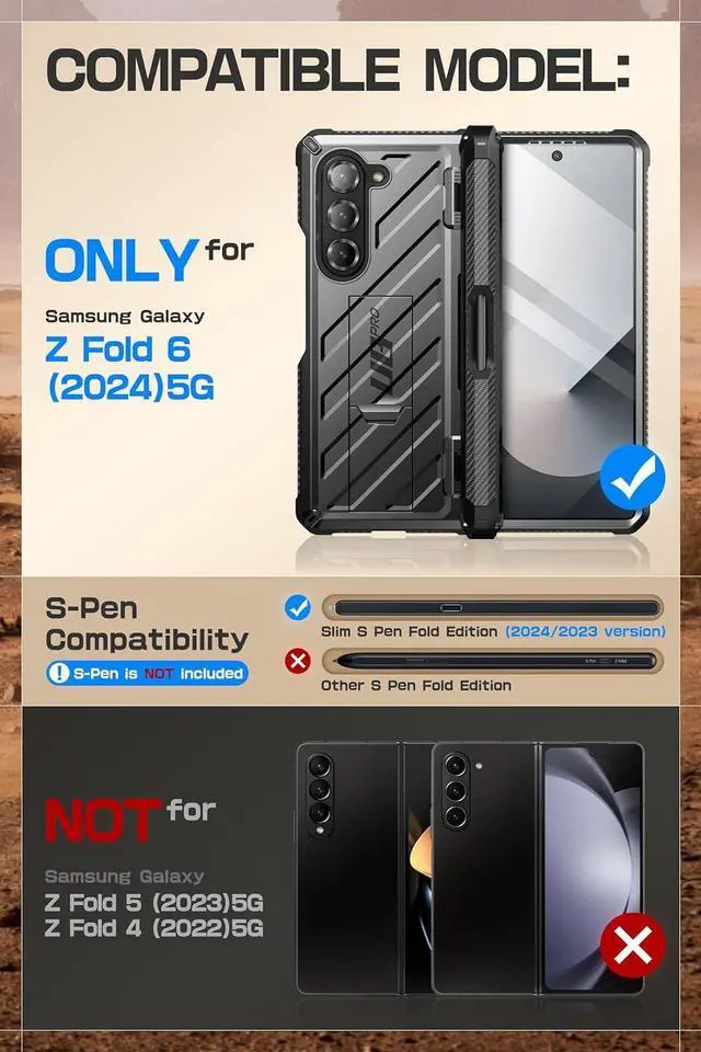 [Full Body Hinge Protection] The SUPCASE Unicorn Beetle Pro Galaxy Z Fold 6 Case features a design that provides full body hinge protection offering comprehensive coverage for your Galaxy Z Fold 6 (2024) 5G and effectively protecting the Z Fold 6 phone hinge from impact damage and scratches. [Built-in S-Pen Holder] The complete hinge of the Galaxy Z Fold 6 Case has a built-in S Pen slot for carrying it. The S Pen display slot in the hinge cover makes it easy to put in or take off the S Pen to prevent loss keeping your S Pen within reach wherever you go.
