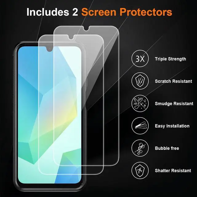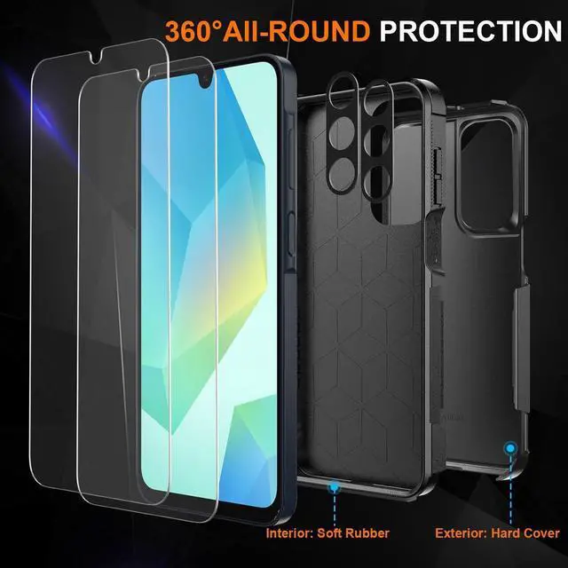 Designed forDesigned Galaxy A16 5G case only designed with Galaxy A16 5G 2024 Released. Double-layer Quality MaterialMade of flexible rubber inner cover and hard polycarbonate back cover protect your phone from daily wear and tear. Comfortable grip with the case brings you a pleasant using experience. Thorough Camera & Screen Protection 2.0 mm raised lips over screen and 2.0 mm raised lips over camera relieves impact and protects the phone screen and camera against drop damage horizontal area the device touchscreen will not make contact with that surface. Screen Protector and Camera Lens Cover2 tempered glass screen protectors with high touch sensitivity prevent scratches and cracks and 2 camera protectors protects the phone camera And will not affect the quality of the photo.