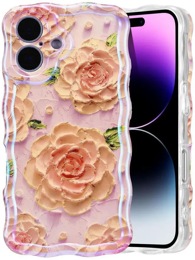 VAREQOY Case for iPhone 16 Plus, Colorful Retro Oil Painting Flower Laser Glossy Pattern Cute Curly Wave Edge Exquisite Phone Cover Stylish Durable TPU Protective Case for Girl Women - Pink Peony