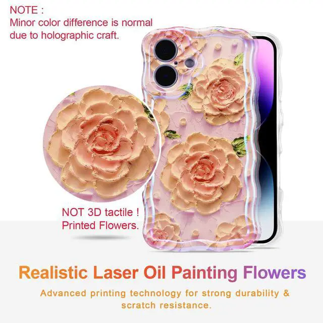Q : Does the flower pattern on the back of this case have a touch of 3D three-dimensional texture?A : NO. These shiny flowers are printed and look like 3D, but without the tactile feel of 3D textures.Minor color difference is normal due to the holographic craft.Anti-fall Drop Buffer Technology Design: This case is made of superior material.Soft TPU bumper provides the phone with sturdy protection, strong anti-scratch and shock absorption.Trendy Dreamy Pretty High-end Aesthetic Style: Unique retro oil painting flash diamond floral pattern print design to make your phone stand out and show your beauty, making your phone more elegant, eye-catching.The outer layer of the phone case will reflect blue light, giving it a special gorgeous shine.Easy to Clean: The close-fitting precisely aligned design prevents dust, dirt from entering the phone and is easy to clean with wet wipes.Camera Protection: Raised edges on the camera to protect it if accidentally dropped or hit.Full body protection: The protective cover offers full body protection and effectively protects your mobile phone from scratches, scrapes and damage.High-class TPU bumper, raised bezels, higher lens guard provide the phone with superb protection.Package Content: 1 x Cell Phone Case.Ideal Choice as a Gift: This case is perfect as a birthday, holiday, anniversary, Christmas and Valentine's Day gift for family, friends and loved ones.