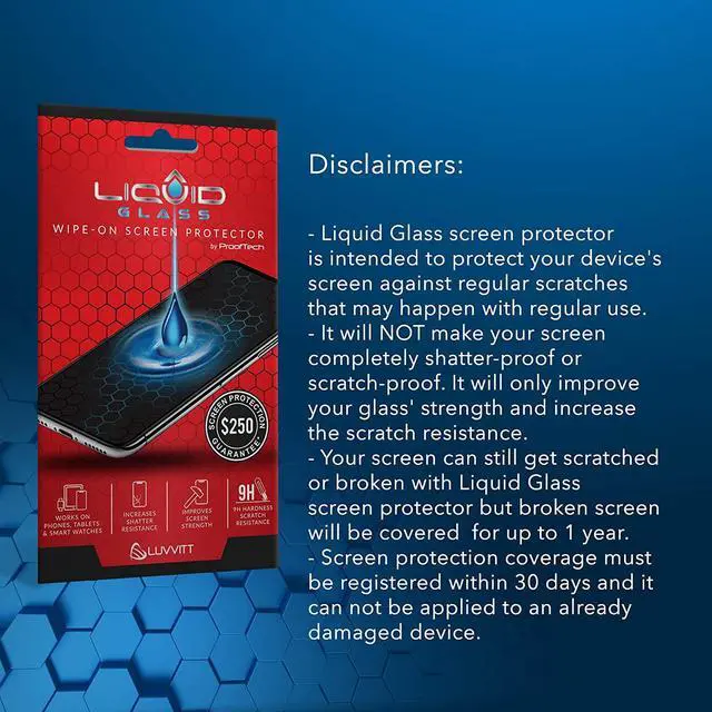 Liquid Glass by ProofTech is an advanced technology invisible wipe-on screen protector that bonds to the glass of your device offering enhanced scratch moisture and impact resistance. Made of silica dioxide (Si02) which is essentially microscopic particles of glass suspended in a liquid solution. Fills in the imperfections of the screen and adds an additional layer of glass (should not be used to repair broken screens. Does not fix existing scratches or damages). Adds an additional extremely thin layer of glass that is highly scratch & shatter resistant and increases the glass' strength to 9 H hardness level.