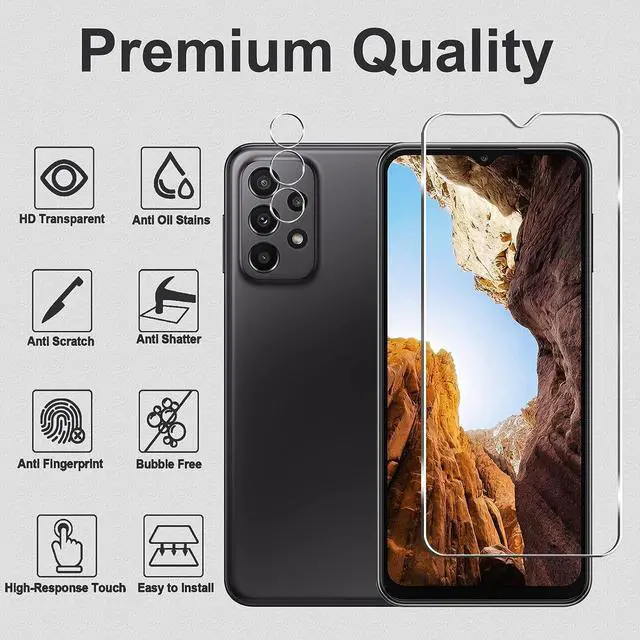 Compatible Models: Designed for Galaxy A23 5G/4G screen protector not fit for other models; Package includes 3 pcs tempered glass screen protector and 3 pcs camera lens protector 3 wet & dry wipes 3 dust stickersScratch