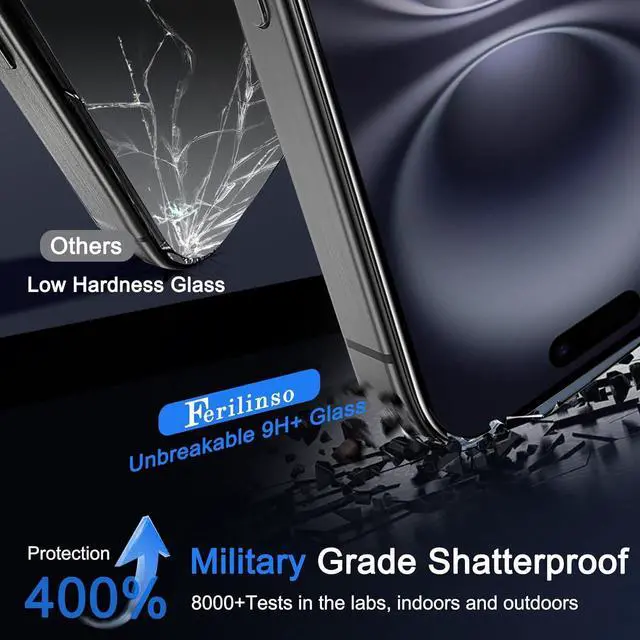 Screen: Simulating iPhone's screen design Ferilinso envelops the screen's every curve with a reinforced 1:1 3D curved black edge getting the most vulnerable screen edge fully covered. Also it is visually invisible as it blends seamlessly with the screen! leaving no corners uncovered and preventing dust and scratches from invading while also being suitable with 99.99 % cases. Unbreakable 9H+ Glass 2nd