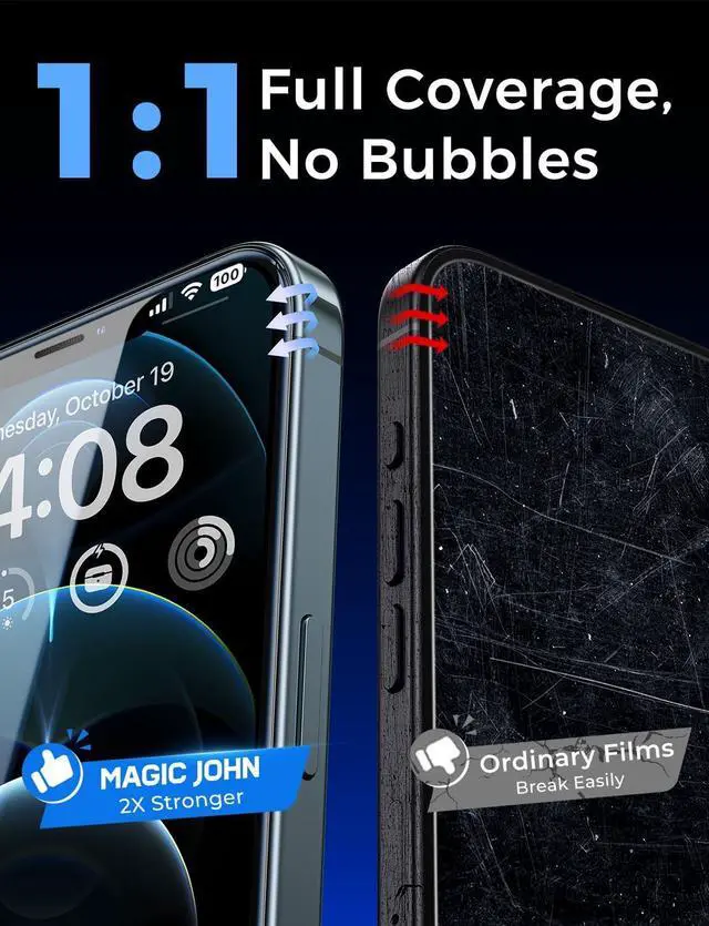 [Automatic Dust Removal Tech] Just cover and pull the screen protector automatically aligns and takes away the dust. No more worrying about bubbles and dust. Watch our Installation Video to see how easy it is to use our Dust-Elimination Installation Screen Protector. [Speaker Dust Cover] The speaker dust cover is waterproof and dust-proof and does not affect the speaker's volume. [Screen Protector Compatible with iPhone 12 Pro Max 6.7 inch] Specially designed ONLY for iPhone 12 Pro Max 100% touch accurate. Not compatible with any other iPhone models. [Anti-Fingerprint] MAGIC JOHN tempered glass screen protector for iPhone 12 Pro Max 6.7 inch is finished with oleophobic coating to against oil residue from fingerprints from long-term use.