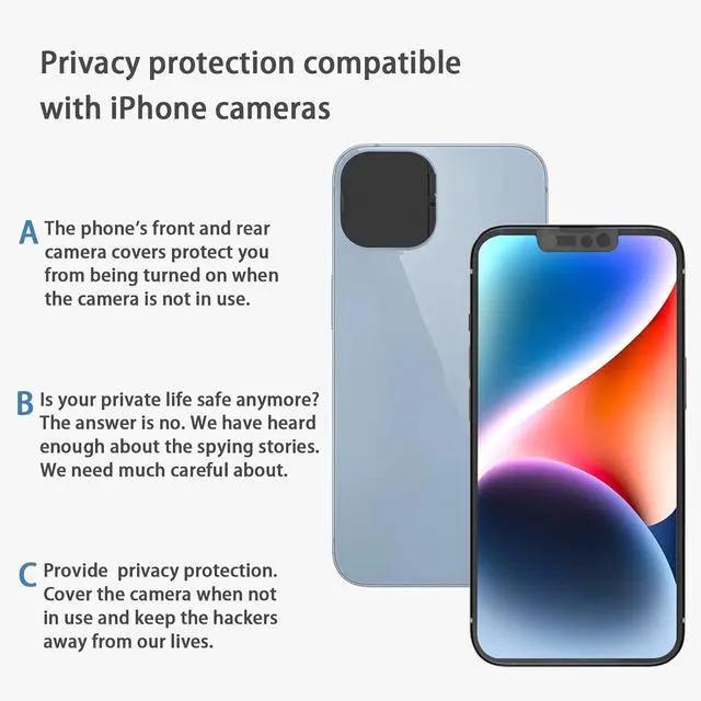 Package contains 2 camera lens cover compatible for Phone14 /Phone 14 Plus and 2 front camera cover compatible for Phone14 /Phone 14 Plus (BlackThe front webcam cover is compatible for Phone 14 Phone 14 Plus. Does not affect normal photography and video can prevent scratches or wear. Please make sure your phone matches this series. The back camera cover is just compatible for Phone 14 /Phone 14 Plus. Please make sure your phone matches this series. Webcam lens back camera cover is designed to protect the rear camera lens on your phone from collisions and keep it clean.