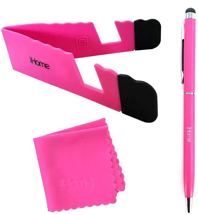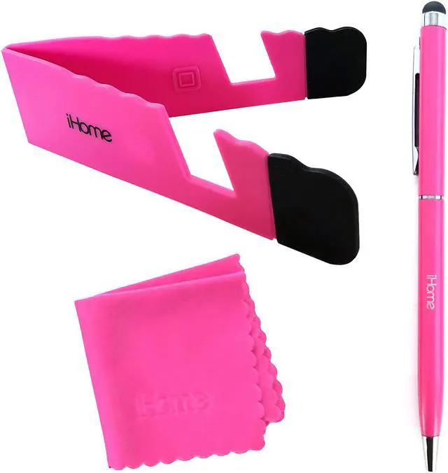 iHome tablet and smartphone 3-in-1 bundle includes cleaning cloth, 2-in-1 stylus pen and a tablet/smartphone stand.
