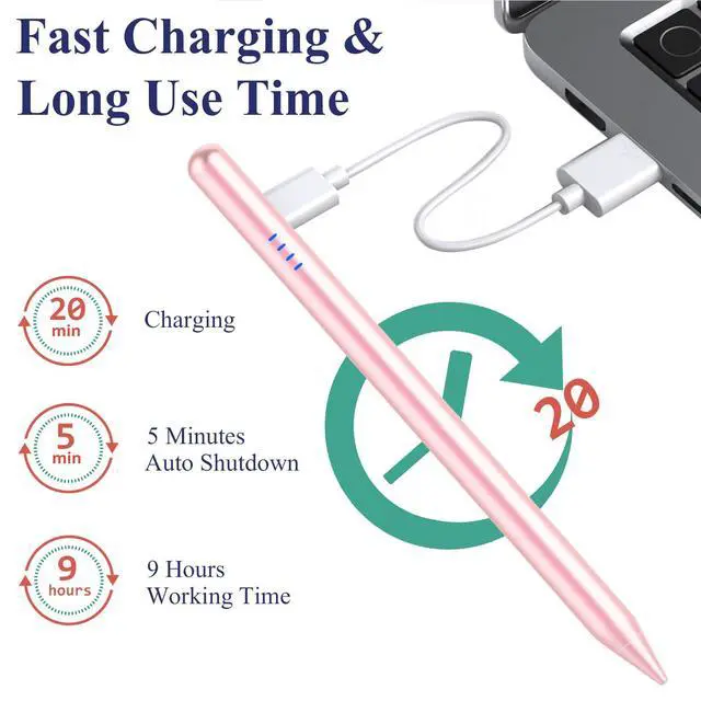 - [Fast Charging & Long Battery Life]Kenkor ipencil With USB-C cable, With USB-C cable, takes 20 minutes to fully charge and lasts up to 9-hours usage. This tablet stylus for iPad can standby for 65 days, and stylus is equipped with smart energy-saving features, automatically switching to "sleep mode" after 5 minutes of inactivity to conserve power and avoid unnecessary battery consumption.