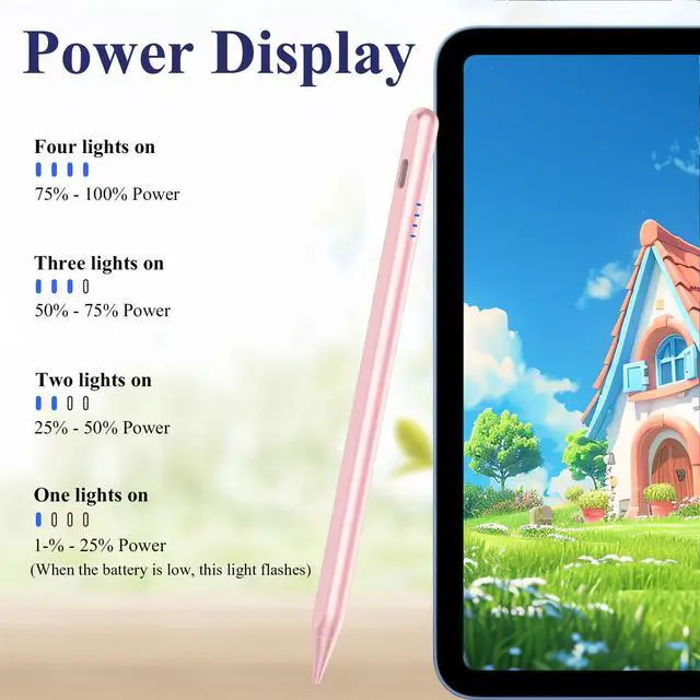 - [Power Display]This pencil for ipad also features LED indicators to show the remaining battery power and charging progress, ensuring you can easily and clearly see the remaining power in any situation and alleviating concerns about battery life. Power display: four lights on: 75%-100% power, three lights on: 50%-75% power, two lights on: 25%-50% power, one light on: less than 25% power.